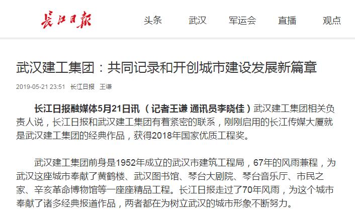 長江日報融媒體5月21日訊 (記者王謙 通訊員李曉佳)武漢建工集團相關(guān)負責人說,長江日報和武漢建工集團有著緊密的聯(lián)系,剛剛啟用的長江傳媒大廈就是武漢建工集團的經(jīng)典作品,獲得2018年國家優(yōu)質(zhì)工程獎。