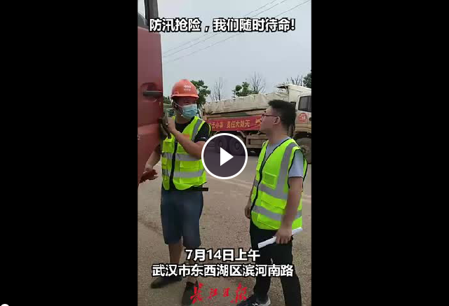 武漢建工集團防汛搶險第一分隊的260多位隊員與數(shù)十臺搶險車輛及機械設(shè)備,在武漢市東西湖區(qū)濱河南路集結(jié)待命。